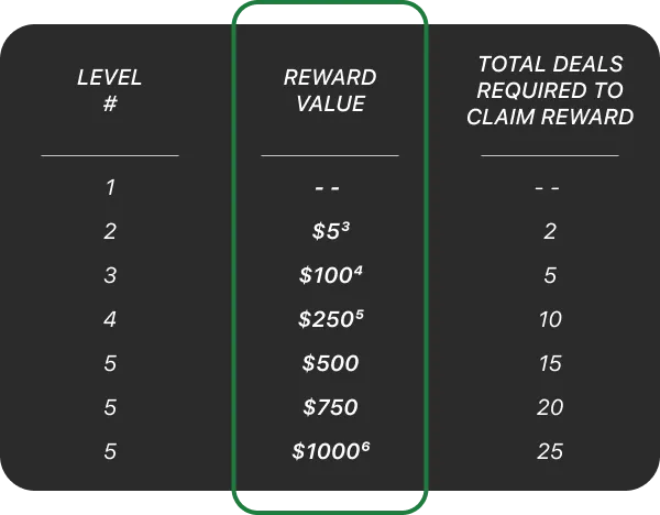 ⁶ Level 5 Reward value depends on the number of Deals completed. $500 Reward requires completion of one Level 1 Deal, one level 2 Deal, three Level 3 Deals, five Level 4 Deals, and five Level 5 Deals. $750 Reward requires completion of one Level 1 Deal, one level 2 Deal, three Level 3 Deals, five Level 4 Deals, and ten Level 5 Deals. $1000 Reward requires completion of one Level 1 Deal, one level 2 Deal, three Level 3 Deals, five Level 4 Deals, and fifteen Level 5 Deals.